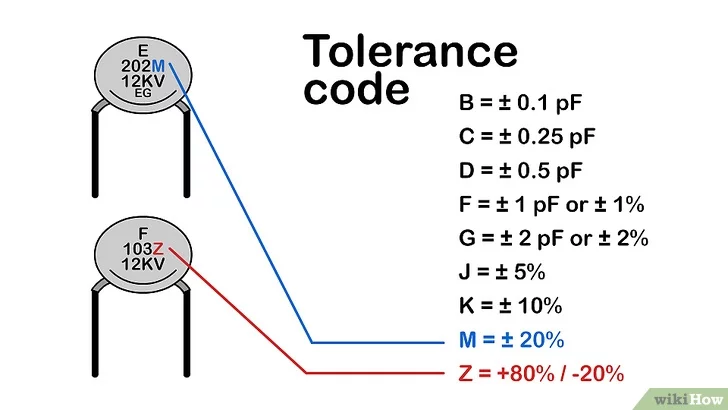 Los capacitores de cerámica, los cuales suelen ser dos pequeños “panqueques” con dos clavijas, generalmente indican el valor de tolerancia en una letra ubicada inmediatamente después del valor de capacitancia de tres dígitos. Esta letra representa la tolerancia del capacitor, es decir, lo cerca que el valor real de dicho capacitor podría estar del valor que se indica en este.