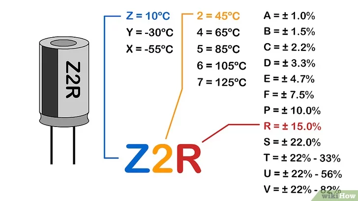 - El tercer símbolo indica la variación en la capacitancia en este rango de temperatura. Este varía desde el más preciso, A = ±1,0 %, hasta el menos preciso, V = +22,0 %/-82 %. R, uno de los símbolos más comunes, representa una variación de ±15 %.