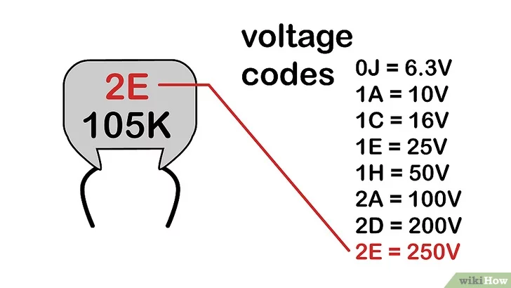 - Por ejemplo, el código «1A253» en realidad se trata de dos códigos. 1A indica el voltaje, mientras que 253 indica la capacitancia, tal como se describe previamente.