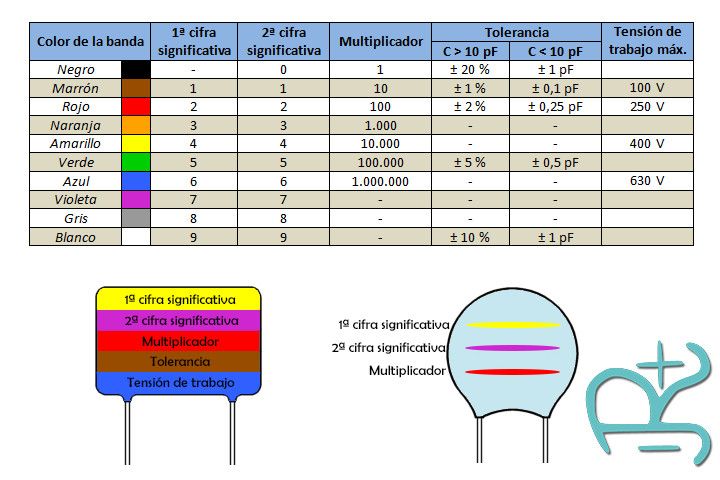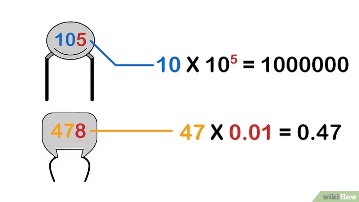 El código de capacitancia de tres dígitos funciona de la siguiente manera:Si el tercer dígito tiene un valor de entre 0 y 6, agrega tantos ceros al final como corresponda a dicho número. (Por ejemplo, 453 → 45 x 103 → 45 000).