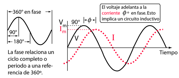 Cuando los condensadores o las inductancias están instaladas en un circuito de corriente alterna AC, los picos del voltaje y la corriente, no ocurren al mismo tiempo. La fracción de la diferencia de periodo entre esos picos expresada, se dice que es la diferencia de fase. La diferencia de fase es <= 90 grados. Se acostumbra a usar el ángulo por el que el voltaje adelanta a la corriente. Esto nos lleva a una fase positiva para circuitos inductivos, ya que en estos la corriente está retrasada respecto del voltaje. La fase es negativa para los circuitos capacitivos, puesto que la corriente adelanta al voltaje.