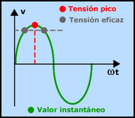 El valor eficaz de tensión de una corriente alterna es el equivalente al valor de tensión de una corriente continua que produce el mismo calor (es decir que provee la misma energía) durante un mismo período de tiempo. Si la señal alterna tiene forma senoidal, el valor eficaz se calcula como: