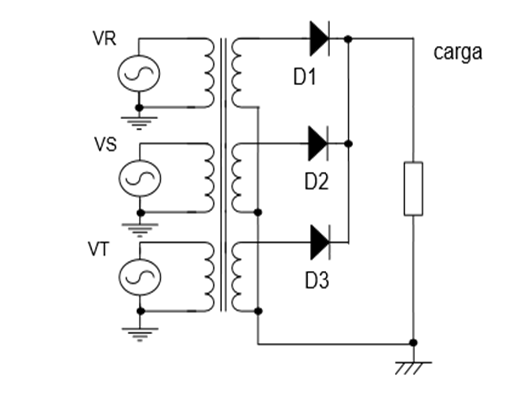Consisten en conectar un diodo a la salida de cada arrollamiento, que se unirán en un punto común que después alimentará a la resistencia o carga del circuito. El retorno de la corriente se realiza a través de la línea de neutro. La imagen inferior nos aclara esta explicación.