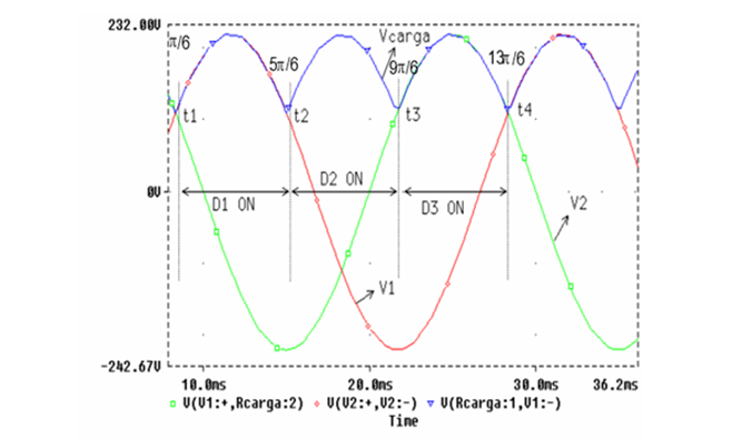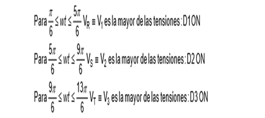 - A partir del análisis del circuito podemos obtener los intervalos de conducción de cada uno de los diodos, pues por ejemplo para el diodo D1, su duración dependerá del instante en que V1=V2 y V1=V3: