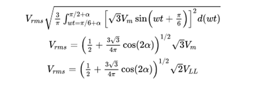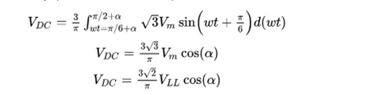 Cuando wt=(π/6+α), el tiristor T6 ya está conduciendo, y el tiristor TI se activa. Durante el intervalo (π/6+α) ≤ wt ≤ (π/2+α), los tiristores TI y T6 conducen y aparece el voltaje de línea a línea Vab = Van – Vbn a través de la carga. Cuando wt =(π/2+α), se dispara el tiristor T2 y de inmediato el tiristor T6 se polariza en sentido inverso. T6 se desactiva por conmutación natural. Durante el intervalo (π/2+α)≤ wt ≤(5π/6+α) conducen los tiristores TI y T2 Y aparece el voltaje de línea a línea Vac a través de la carga. Si se numeran los tiristores como se indica en la figura del circuito rectificador trifásico controlado, la secuencia de disparo es 1-2,2-3,3-4,4-5,5-6 y 6-1.