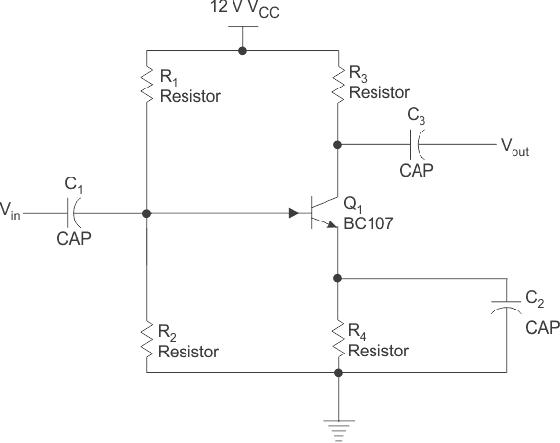 La figura muestra un amplificador CE de una sola etapa. do1 y C3 son condensadores de acoplamiento, se utilizan para bloquear el componente de CC y pasar solo una parte de CA, también aseguran que las condiciones de conexión de CC del BJT permanezcan sin cambios incluso después de que se aplique la entrada. do2 es el capacitor de derivación que aumenta la ganancia de voltaje y evita la R4 Resistencia para señales de ca.