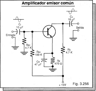 se muestra un amplificador emisor común práctico. La señal se inyecta a la base a través de Ci y se recibe amplificada del colector vía Co. El emisor, conectado dinámicamente a tierra a través de ce, actúa como elemento común a los circuitos de entrada y de salida. Observe que en este modo de conexión, las señales de entrada y de salida siempre están en oposición de fase