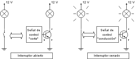 el transistor se comporta como un circuito abierto entre el emisor y el colector, no existe corriente y la bombilla estará apagada. En el segundo caso, cambiando la señal de control, se cierra el circuito entre C y E, y los 12V se aplican a la bombilla, que se enciende.