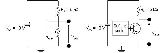 Si el valor de la resistencia del potenciómetro se fija en 5 kW, la tensión de salida VOUT será de 5 V. Al aumentar esta resistencia, la salida también aumentará de valor. Por ejemplo, con 20 kW VOUT resulta ser 8 V. Modificando el valor del potenciómetro se puede obtener cualquier valor en la salida comprendido entre 0 V y 10 V, ya que: