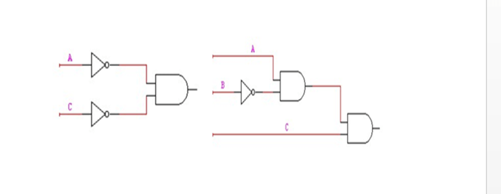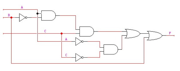 siendo A,B,C las entradas. La Implementación parcial con puertas AND, OR Y NOT sería:
